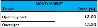 The Overnight rate decreased by 0.25 % to close at 13.50 % as against the last close of 13.75 %., while the Open Buy Back rate remained unchanged at 13.00 %.
