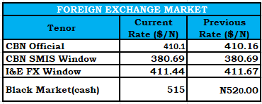 At the I&E FX market, Naira appreciated by 0.06 % as the dollar was quoted at ₦411.44 as against the last close of ₦411.67. Most participants maintained bids between ₦387.67 and ₦413.00 per dollar.