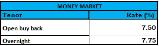 The Overnight rate decreased by 3.25 % to close at 7.75 % as against the last close of 11.00 percent, and the Open Buy Back rate also decreased by 3.25% to close at 7.50 % compared to 10.75 % on the previous day.